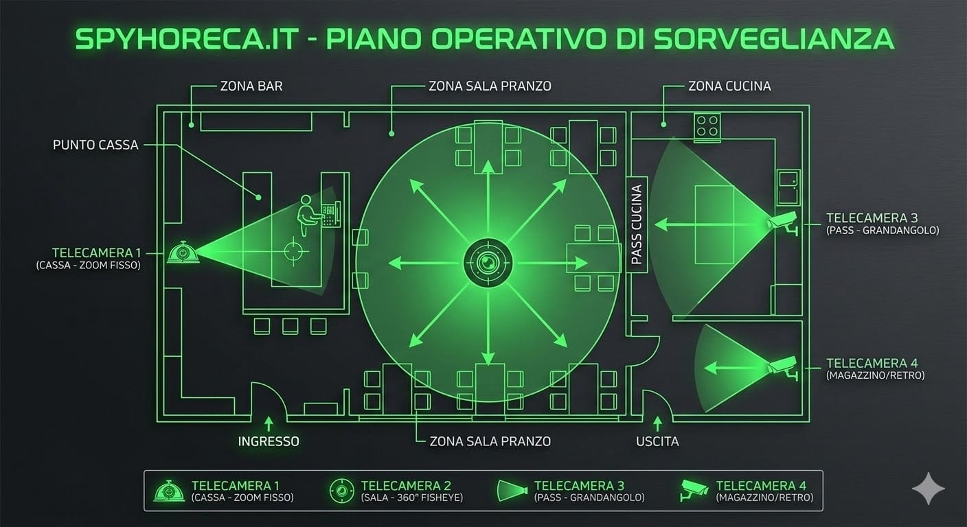 Punti Critici: Cassa, Pass della cucina, Magazzino alcolici e Zone d'ombra della sala.